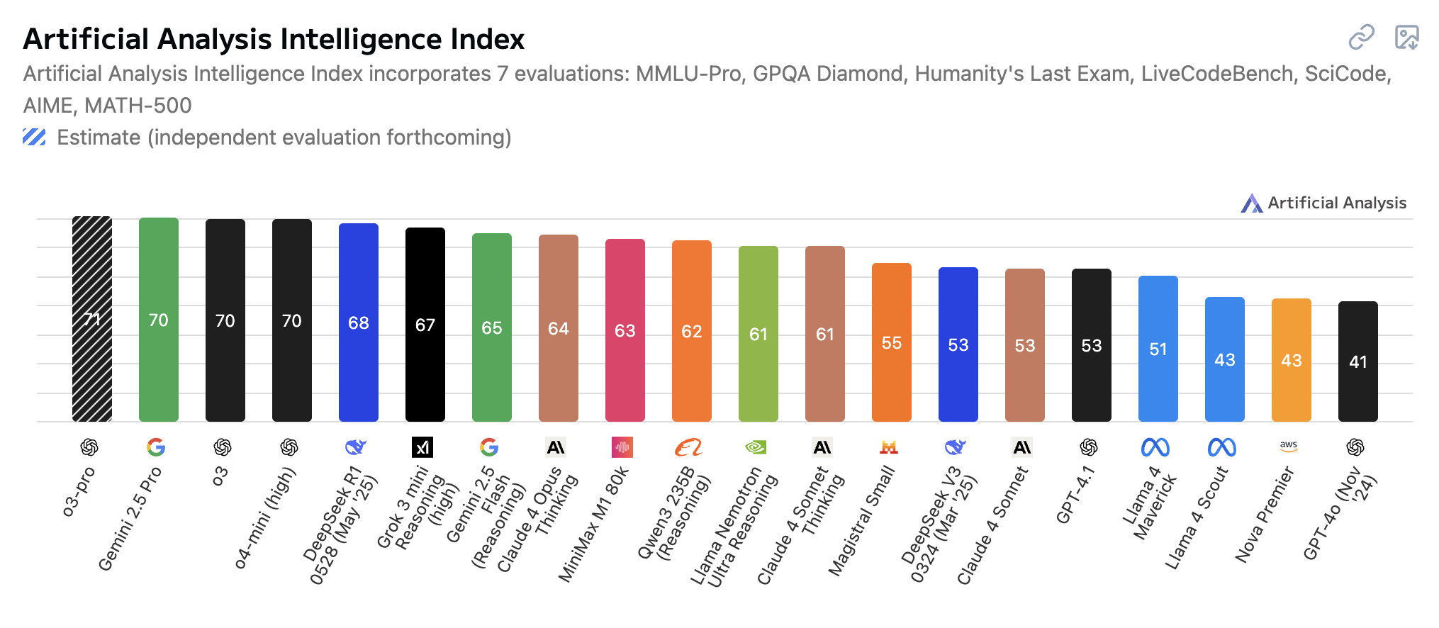 저는 우선 사용하고 있는 AI는 크게 ChatGPT 유로 버전과 Perplexity 유료 버전을 주로 사용하고 이외에 필요한 부분에 특화된 AI를 찾아서 사용하고 있습니다. 아래에서 간단하게 제가 사용하는 AI 모델들에 대한 소개와 제가 사용하는 방법 그리고 꿀팁을 간단하게 소개해드리려고 합니다. 들어가기에 앞서 아래는 현재까지 나온 다양한 대형 언어 모델(LLM)의 종합 성능을 비교한 Artificial Analysis Intelligence Index 결과를 막대그래프로 나타낸 것입니다. 쉽게 말해 우리가 흔히 일상에서 사용하는 챗봇 스타일의 대화형 AI 모델들의 지능 순위 싸움(?)이라고 생각하면 쉬울 것 같습니다. 현재는 OpenAI의 o3-pro가 1등이고, Google의 Gemini 2.5 pro가 2등 OpenAI의 o3 모델이 3등순으로 나열되어 있습니다.