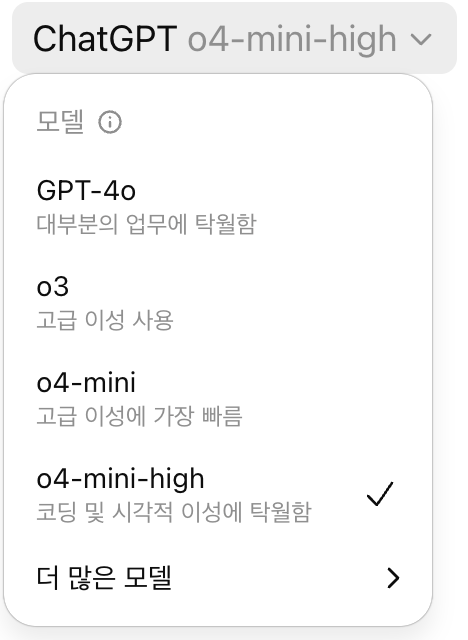 - 꿀팁: 평상시에는 GPT-4o를 가장 많이 사용하는데 이유는 추론 속도가 다른 모델에 비해 빠르기 때문에 너무 어려운 질문이나 코딩 같은 것을 물어보지 않는 이상 대부분의 답변은 GPT-4o가 훌륭하게 할 수 있기 때문에 가장 많이 사용합니다. 여기서 말하는 추론 속도는 AI에게 우리가 질문 했을 때 답변이 나올 때까지 시간을 말합니다. 또한 코딩이나 어려운 수학 질문 그리고 다양한 복잡한 연산들을 사용해야 할 때는 o4-mini-high를 사용합니다. 모든 질문에 o4-mini-high를 사용하지 않는 이유는 chatGPT PRO 요금제에서는 o4-mini-high를 사용하다가 특정 사용량을 넘기면 다음날이 돼서야 사용할 수 있기 때문이기도 하고 o4-mini-high는 생각보다 간단한 질문에도 답변 시간이 길 때가 있기 때문에 보통은 GPT-4o를 많이 사용합니다.