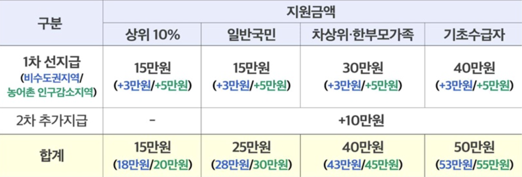 대상별 지원 금액은 이미지 속 내용과 같습니다. 일반적으로는 1차로 15만원, 2차로 10만원 받을 수 있습니다.