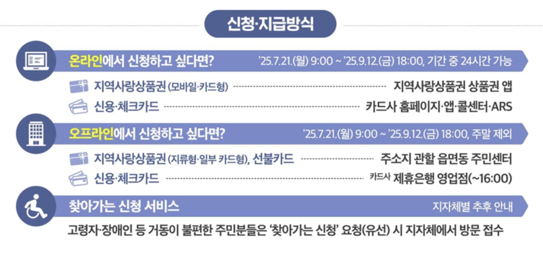 - 앱(지역사랑상품권) 또는 누리집에서 신청 후, 지류형·선불카드는 행정복지센터 방문 수령