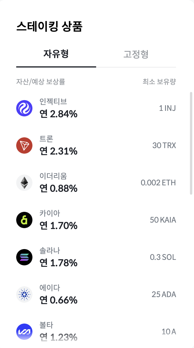 • 자유형 스테이킹: 거래, 입출금이 자유롭고 보상이 자동 적립됩니다.