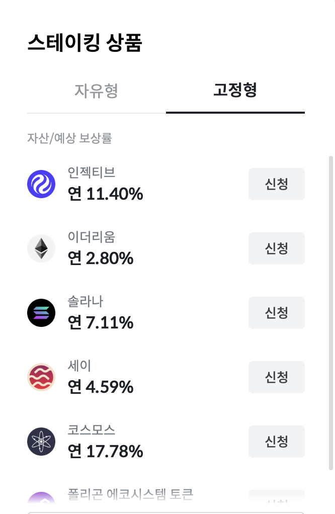 • 고정형 스테이킹:  스테이킹을 신청한 가상자산의 거래, 입출금이 제한되지만 더 높은 이율로 보상을 받을 수 있습니다.