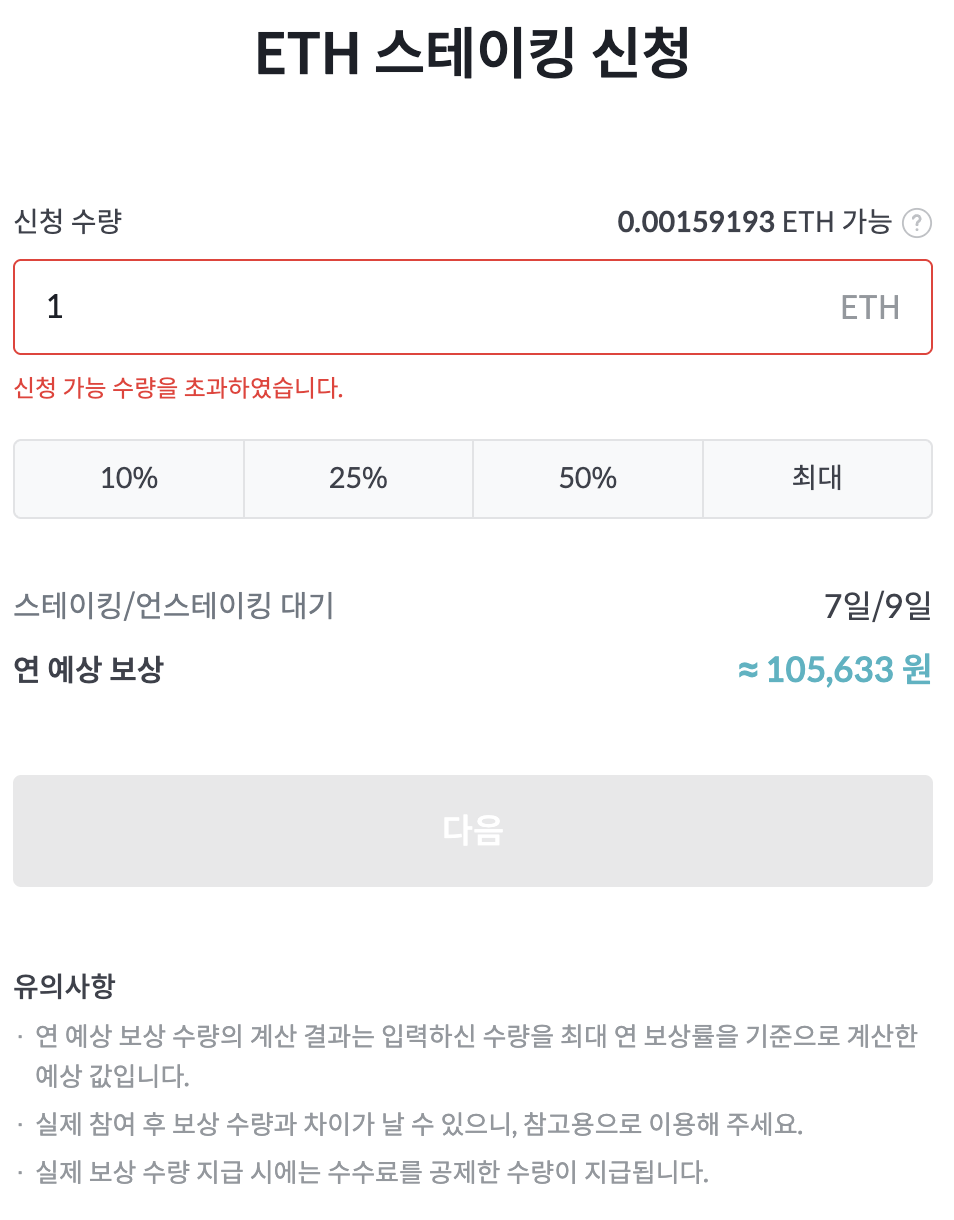2-3) 그러면 다음과 같이 연 예상 보상이 나오게 되며, 다음을 누른 후 상품 유의 사항에 동의하면 스테이킹이 완료됩니다.