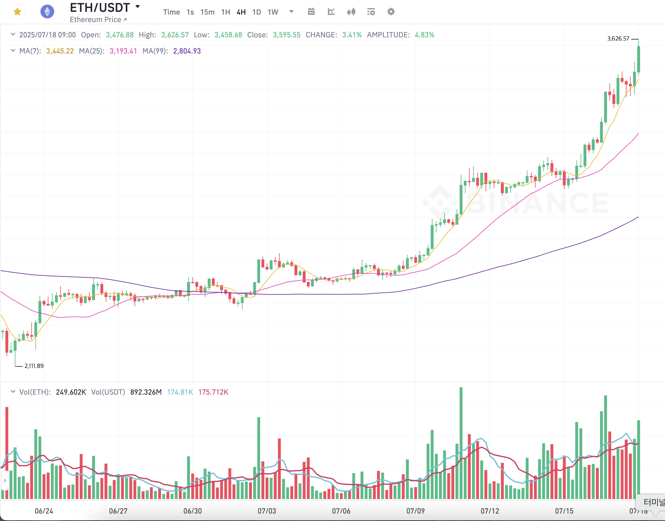 현재 ETH 가격은 7월 18일 종가 기준 약 $3,600로, 지난 일주일간 약 21.5% 상승하며 강력한 랠리를 이어가고 있습니다. 7월 12일 $2,958에서 출발해 7월 18일 약 $3,600로 껑충 뛰었습니다.