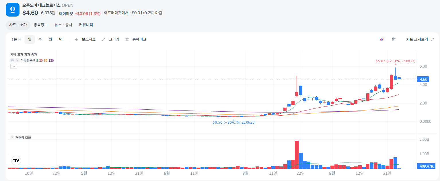 앞으로의 흐름:단기적으로는 리테일 투자자들의 관심과 AI 모멘텀이 맞물리며 추가 상승 여력이 충분히 남아 있습니다. 이미 단기간에 큰 폭으로 올랐음에도 불구하고, 시장 내에서 금리 인하 기대감과 함께 부동산 거래 활성화 기대가 커지고 있어 긍정적인 투자 심리를 지탱하고 있습니다.즉, 단기적인 조정 가능성은 열어 두되, 중장기 성장 스토리와 AI 혁신성을 고려하면 현재 흐름은 여전히 긍정적으로 평가할 수 있습니다. 중장기적으로는 연준의 금리 인하 사이클이 실제로 진행될 경우, 오픈도어가 보유한 AI 기반 수익성 개선 전략이 본격적으로 성과를 내며 실적에 반영될 가능성이 큽니다. 특히 자산 경량화 모델과 AI 가격 산정·거래 자동화가 안정적으로 자리 잡는다면, 오픈도어는 단순한 부동산 거래 기업을 넘어 프롭테크(PropTech) 선도 기업으로 성장할 수 있는 잠재력이 있습니다.